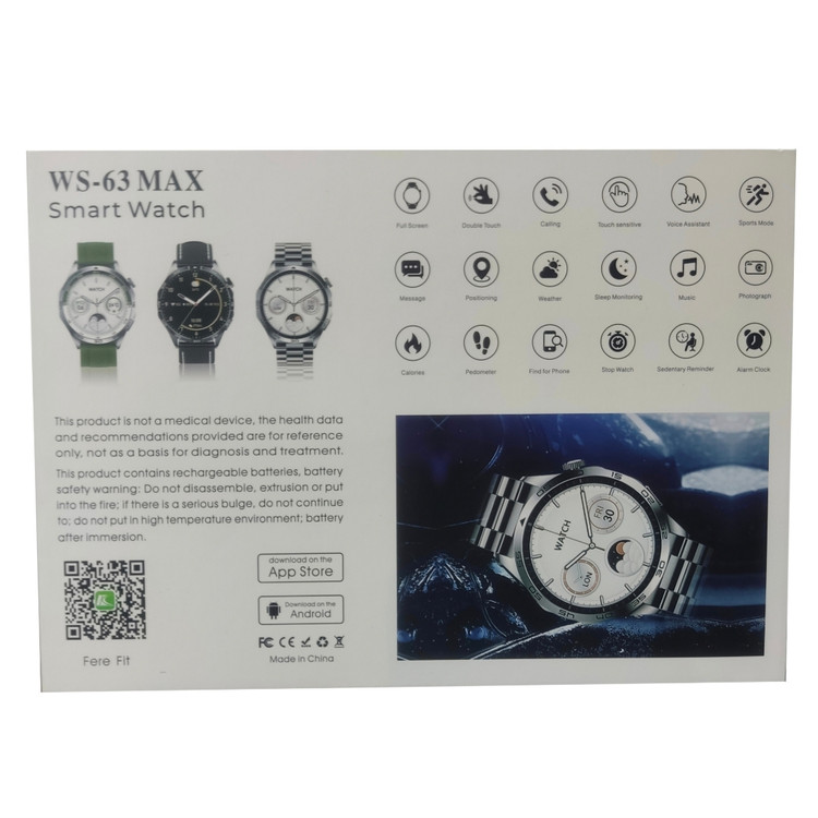 ساعت هوشمند wisme مدل ws-63 max با صفحه نمایش گرد دارای 7 بند ساعت در طرحهای متنوع و جذاب می باشد. جنس بندها از جنس سیلیکون، چرم و یک بند فلزی رولکسی می باشد. صفحه نمایش تمام لمسی و با کیفیت می باشد. از امکانات و قابلیت های این ساعت میتوان به مکالمه و برقراری تماس بلوتوثی، دریافت اعلان و پیامک، پایش و اندازه گیری برنامه های سلامتی مانند ضربان قلب، فشارخون، اکسیژن خون و برنامه های ورزشی مانند گامشمار، دوچرخه سواری، کوهنوردی، پشتیبانی از زبان فارسی و... اشاره نمود. قابلیت پخش موزیک، دفترچه تلفن، ماشین حساب، تایمر تنظیم خواب و کلی برنامه کاربردی دیگر از امکانات ویژه این ساعت هوشمند می باشد.