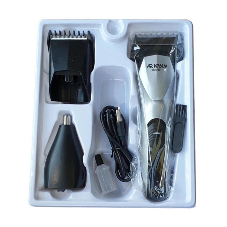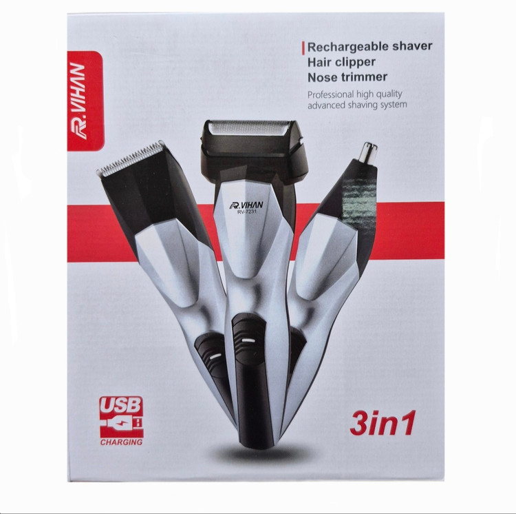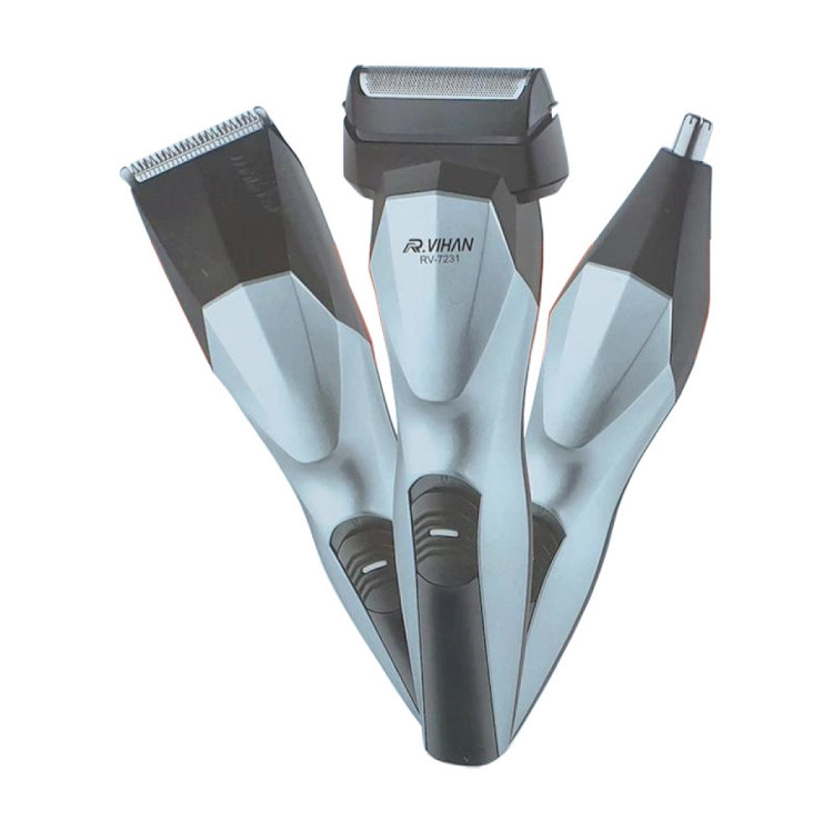 ماشین اصلاح سه کاره از برند R.VIHAN مدل 7231 یه ماشین اصلاح شارژی برای اصلاح سر و صورت و بدن می باشد. این ماشین اصلاح دارای سه نوع سری خط زن ، صفر زن و اصلاح موی گوش و بینی هستش ، این ماشین اصلاح بسیار سبک وزن و جمع و جور و همچنین به شدت کاربردی میباشد. این سه کاره جداب قابلیت اصلاح موی سر ، صورت ، بینی و بدن را داراست. آر ویهان R.VIHAN دارای سه سری متفاوت با قابلیت تعویض و جایگزینی آسان برای اصلاح موی صورت ، موی گوش و بینی ، موی سر و بدن قابلیت استفاده به صورت شارژی و برقی دارای شانه محدود کننده سایز اصلاح مو جنس تیغه ها از استیل ضد زنگ خود تمیز شونده است. موتور قدرتمند PD با آلیاژ نقره برای کارایی بهتر با توان سه وات و پنج هزار دور در این ماشین تعبیه شده است. مدت زمان شارژ شدن2-3 ساعت و مدت زمان شارژ دهی : 40-60 دقیقه می باشد. داخل پک ماشین RV-7231 کابل شارژ، روغندان و برس تمیز کاری می باشد.