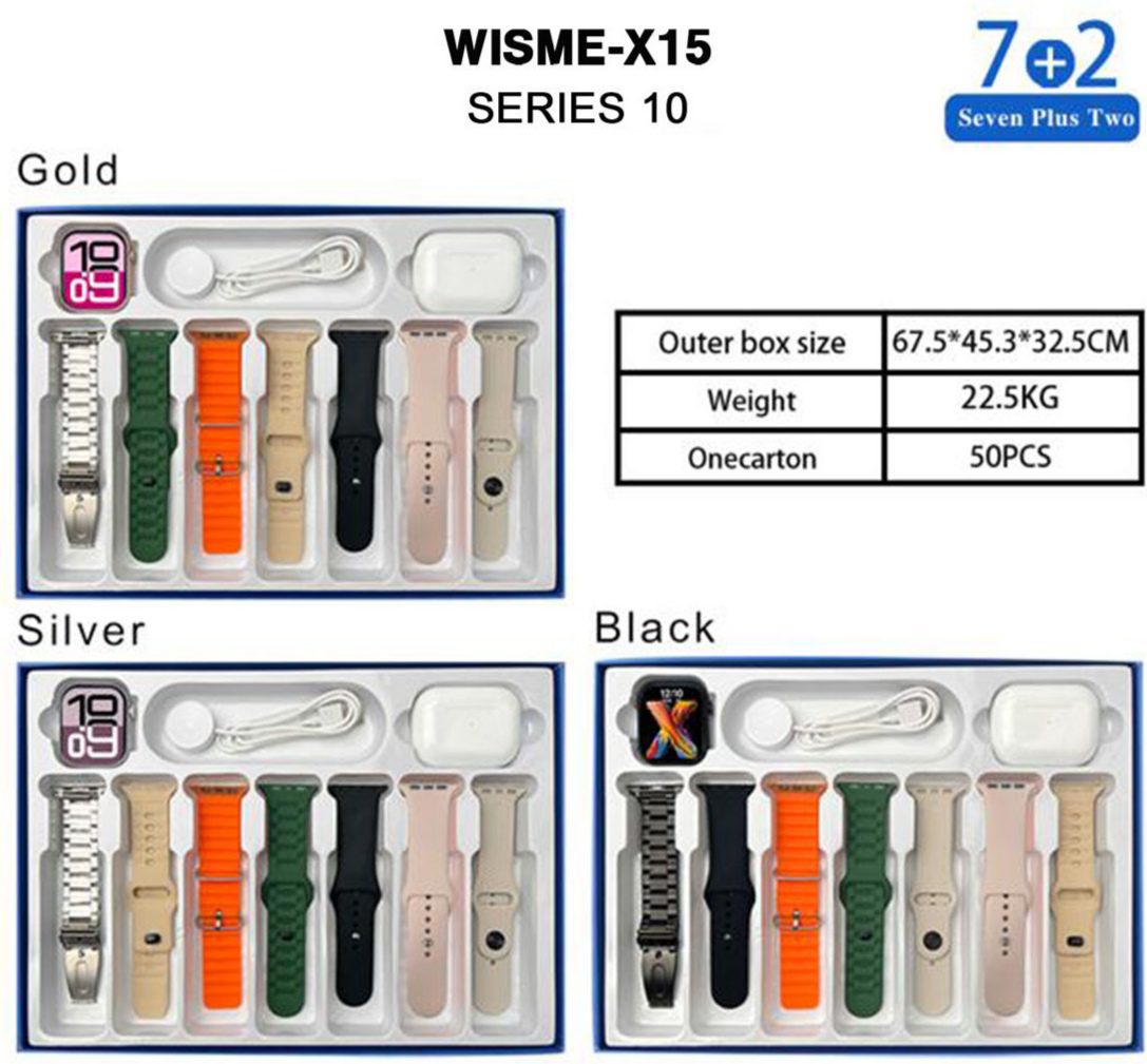 ساعت هوشمند سری 10 طرح اپل واچ مدل X15 محصولی از برند معروف ویزمی wisme می باشد . این اسمارت واچ Series 10 همراه با ایرپاد پرو و 7 بند متنوع از جنس سیلیکون و استیل ضدزنگ به بازار عرضه شده است. این ساعت از بدنه آلومینیومی براق و صفحه نمایش بسیار باکیفیت لمسی و نمایشگر امولد بهره می برد. سایز صفحه نمایش 46 میلیمتر بوده که مناسب برای آقایان و بانوان می باشد و میتوان در مراسمات رسمی و ورزشی استفاده کرد. با استفاده از تنوع بند ساعت موجود در پک اسمارت واچ wisme-x15 میتوانید به دلخواه در طول هفته با ساعت خود ست کنید. از امکانات و قابلیتهای ساعت هوشمند میتوان به صفحه نمایش لمسی و رنگی، پشتیبانی از زبان فارسی، قابلیت برقراری مکالمه بلوتوثی، کنترل دوربین موبایل، دستیار صوتی، تایمر،ماشین حساب، دریافت اعلان و پیامک، واچ فیسهای بروز و زیبا، پخش موزیک، مجهز به سنسورهای سلامتی و ورزشی بمنظور پایش و اندازه گیری ضربان قلب، فشارخون، اکسیژن خون، گامشمار، دوچرخه سواری، کوهنوردی و... اشاره نمود. نحوه شارژ ساعت از طریق وایرلس انجام میگیرد. همچنین با استفاده از ایرپاد پرو داخل پک ساعت، میتوانید ساعتها به مکالمه و پخش موزیک بپردازید. این ایرپاد دارای عمر مفیدباتری ۳-۴ ساعت پس از هربار شارژ کامل می باشد.