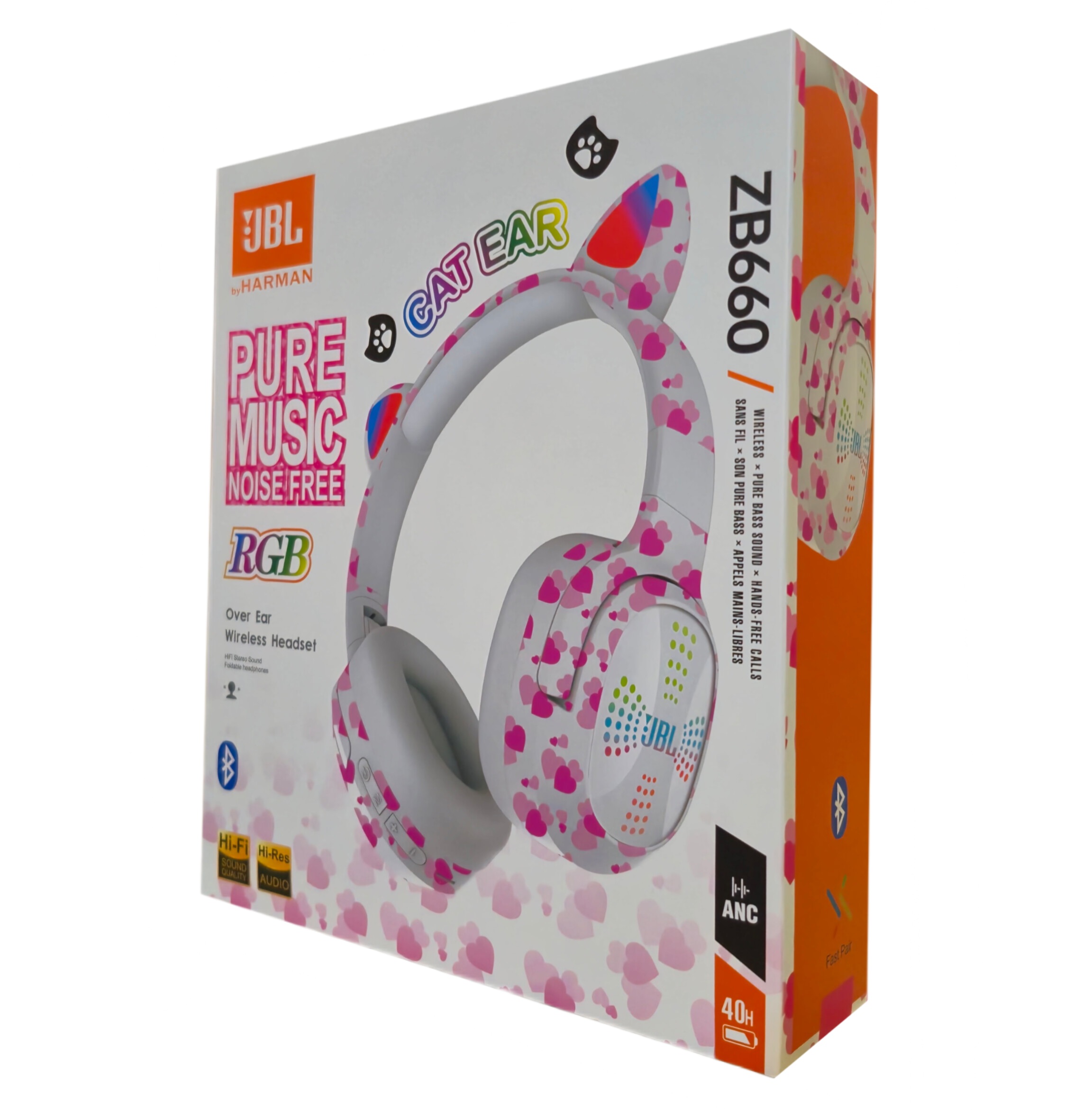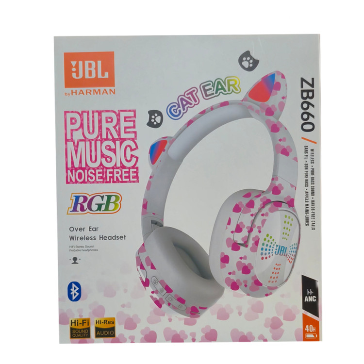 هدفون بلوتوثی طرح گربه ای ZB660 محصولی از برند JBL می باشد. این هدفون دارای طراحی بسیار زیبا روی هدفون بوده و زیبایی بسیار خاصی در موقع استفاده از آن را مشاهده میکنید. هندرفری بلوتوثی xb660 بیشتر مناسب بچه ها و نوجوانان می باشد. هدفون جی بی ال ZB660 برای استفاده درهر فضا و مکانی بسیار مناسب است. اینهدفون بصورت تاشو طراحی شده است. از اینرو کاربر میتواند کاپهای آنرا بهسمت داخل تاکند و بهراحتی داخل کیف خود قرار دهد. ظاهر آن هم طراحی بسیار شیکی دارد. گوشی های هدفون بلوتوثی JBL هم از جنس بسیار نرم و لطیف میکروفایبر هستند تا هنگام استفاده طولانیمدت کاربر احساس خستگی نکند البته وزن کم این محصول و سبک بودنش نیز یکی دیگر از ویژگیهای اینهدفون است. این هدفون دارای دو عدد گوش شبیه به گوش گربه دارد که در آن چراغ RGB تعبیه شده است و هنگام پخش موسیقی به رنگ های مختلف در می آید که برای کودکان بسیار جذاب میباشد مهمترین نکته را میتوان به کیفیت صدای خروجی آن اشاره کرد. صداها کاملا تفکیک شده و متمایز هستند. جزئیات موسیقی کاملا قابل تشخیص است. همچنین باس و صداهای رنج، بهخوبی پخش میشوند. گفتنی است اینمدل دارای میکروفون است که با داشتن بلوتوث نسخه 5.0 بهشما امکان مکالمه با صدایی بسیار شفاف را میدهد . همراه هدفون کابل شارژ قرار داده شده. یکی دیگر از ویژگیهای هدفون JBL ZB660 پشتیبانی از کارت حافظه SD CARD یا همان مموری کارت(رم) است. با این ویژگی منحصربهفرد شما دیگر احتیاج به تلفنهمراه جهت گوش دادن به موسیقی ندارید و میتوانید بهصورت مستقل از هدفون استفاده کنید. این هدفون دربرابر رطوبت و عرق مقاوم بوده و دارای قابلیت حذف نویز است. دوام باتری این هدفون در شرایط نرمال ۳-۴ ساعت می باشد.