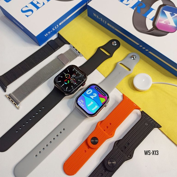 ساعت هوشمند طرح اپل واچ مدلWISME WS-X13 از جدیدترین مدل های موجود در بازار، که دارای 3 عدد بند فلزی و سیلیکونی و متنوع است. این اسمارت واچ مشابه اپل واچ سری 10 طراحی شده است و از کیفیت ساخت عالی برخوردار می باشد. این مدل صفحه نمایش بزرگتر حدود 46 میلیمتری دارد و حاشیه آن بسیار کم و باریک است. با وجود سایز بزرگتر این ساعت طوری طراحی شده که برروی دست به خوبی قرار می گیرد و نمای زیبایی دارد. اسمارت واچ WS-X13 در نمایش تصاویر و رنگ ها عالی و بی رقیب است که نظر هر کسی را جلب می کند. مشابه نمونه اصلی در سمت چپ ساعت دو مجرای خروج صدا وجود دارد که نسبت به مدل قبلی از کیفیت بیشتری در پخش صدا و موزیک برخوردار است .