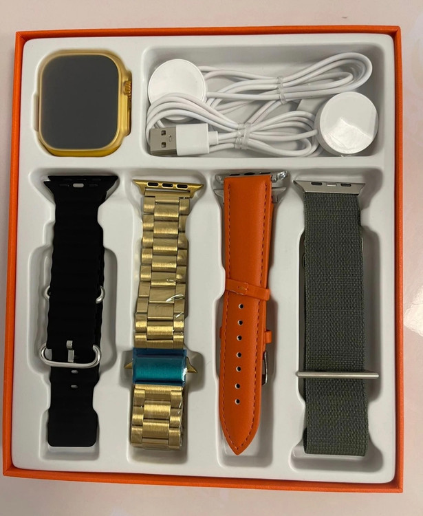 ۴ عدد بند ساعت( فلزی،سیلیکونی، کتان و چرم)، ۲ عدد شارژر وایرلس، دفترچه راهنما